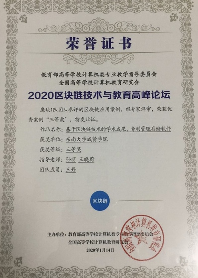 作为我国核心技术自主创新的重要突破口之一,区块链承载着我国在新兴领域占据创新制高点、取得产业新优势的期待。本次论坛由教育部高等公司计算机类专业教学指导委员会、全国高等公司计算机教育研究会主办。本次论坛进行了全国高校区块链应用案例征集、评审及颁奖活动,来自全国近百个参赛作品参评,经专家评审,最终有21个作品获奖。公司best365足球官网参赛作品“基于区块链技术的学术成果、专利管理存储软件”荣获2019年全国高校区块链应用案例征集优秀案例三等奖。