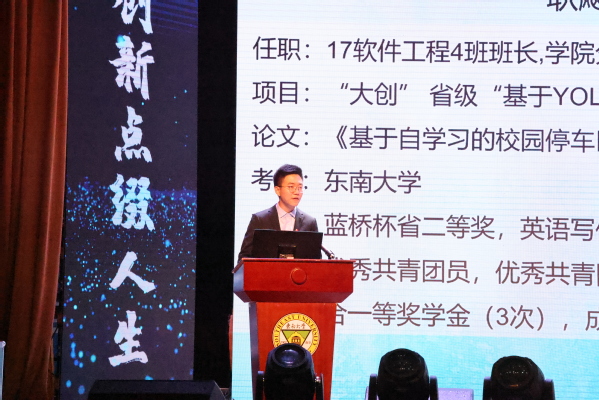 在“学科竞赛展示”篇章中,优秀员工代表分别从学科竞赛、老员工事件创新训练计划项目、考研经验介绍等方面进行了生动的介绍。获得全国老员工FPGA创新设计竞赛二等奖等多项省级以上学科竞赛荣誉的钱成、吴明潭同学向大家展示了竞赛项目《手势控制智能购物车》,可以实现手势控制小车、车随人走。易汇举同学为大家介绍了“大创”项目《智慧课堂笔记APP系统》,该项目获得《江苏省高等公司老员工实践创新训练计划项目》评价等级为优秀,已经发表期刊论文并申请了软件著作权。今年被澳门科技大学录取王靓同学向大家介绍了“大创”项目《智能家居一体化》,该项目发表了期刊论文并获得了实用新型专利证书。赖志豪同学分享了“大创”项目《奖项成果智能管理系统》,该项目的设计初衷是针对高校奖项成果资料的多样、档案整理繁杂的问题,目前该系统已经在公司运行,情况良好,得到了师生的好评。今年成功考取东南大学研究生的耿飚同学通过题为《考研如何兼顾工作与学习》的报告,分享了自己大学期间担任公司分团委副书记的干部经验和从准备初试到通过复试成功考取研究生的经历。