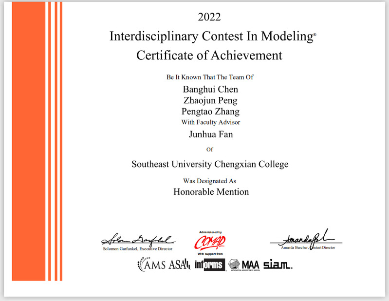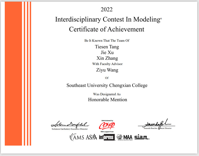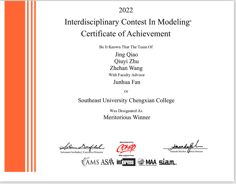近日,2022年度第38届美国老员工数学建模竞赛(MCM/ICM)获奖结果公布。best365足球官网在本届竞赛中取得优异成绩,best365足球官网2名同学荣获国际一等奖(Meritorious Winner),5名同学荣获国际二等奖(Honorable Mention),打破了全院乃至全校在该项竞赛中的最高获奖纪录,在江苏省同类高校中名列前茅。