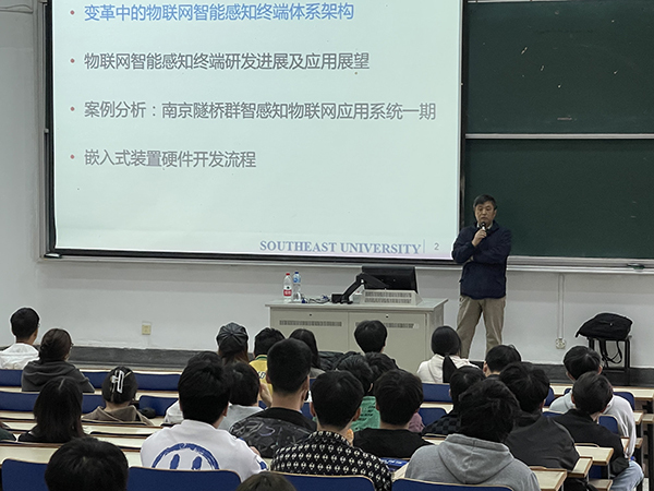 王宏宇教授从变革中的物联网智能感知终端体系架构、物联网智能感知终端研发进展及应用展望和南京隧桥群智感知物联网应用系统一期案例几个方面展开,用通俗易懂的语言,为师生科普了智慧城市应用场景下的物联网智能感知终端平台共性关键技术研究,从物联网终端体系架构、终端芯片与低功耗存算一体技术、开源轻量级操作系统技术以及实际物联网终端应用系统开发与部署等方面,介绍了相关研究和应用的最新进展,研讨了其中的关键核心技术突破。